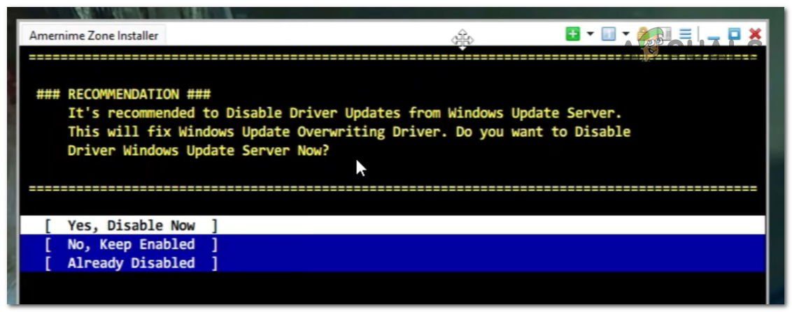 - الآن سيُطلب منك ما إذا كنت ترغب في تعطيل تحديث التعريف من خادم تحديثات Windows. يُنصح بالقيام بذلك، لأنه إذا لم يتم تعطيله، سيقوم Windows بتثبيت تحديثات أحدث فوق هذا التعريف وكتابة فوقه. لتعطيله، تحتاج إلى الضغط على Enter.