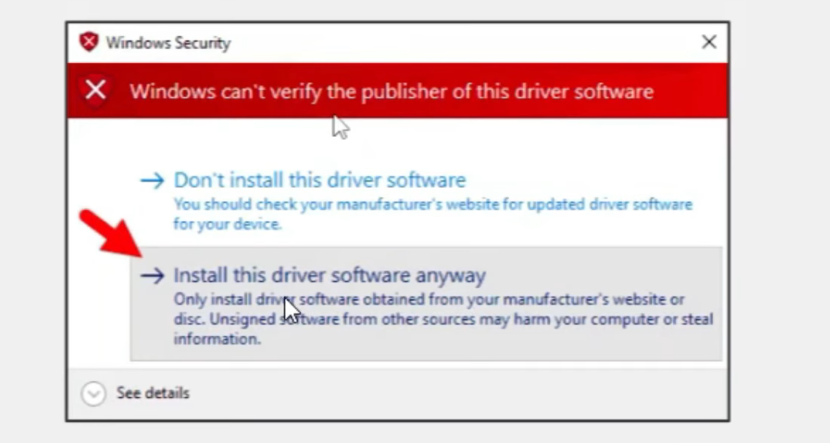 - ستسألك أمان Windows (Windows Security) عما إذا كنت ترغب في متابعة تثبيت هذا التعريف لأنه ليس تعريفًا رسميًا. انقر على Install this driver software anyway (تثبيت برنامج التعريف هذا على أي حال) لتأكيد رغبتك في ذلك.