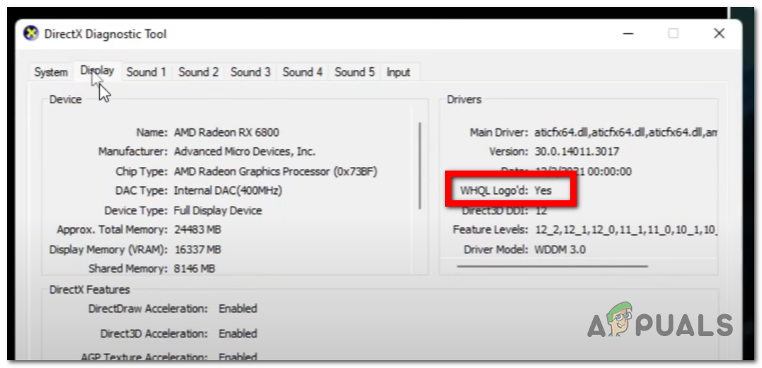- بعد اكتمال تثبيت التعريف، ستفتح أداة تشخيص DirectX (DirectX Diagnostic Tool) تلقائيًا. تحتاج إلى النقر على قسم العرض (Display) والبحث عن المكان الذي يقول فيه WHQL Logo’d. مباشرة بعد ذلك، يجب أن ترى رسالة نعم (Yes). هذا يعني أن التعريف قد تم تثبيته بشكل صحيح ويتم التعرف عليه كتعريف رسمي بواسطة Windows.