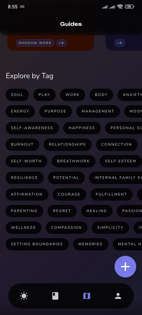 ينظّم التطبيق الأدلة حسب الفئات والوسوم، مثل الصحة النفسية، والعمل والمال، والعلاقات، مما يُسهِّل العثور على محتوى ذي صلة لتحدياتك. أعتقد أن هذا الهيكل هو أفضل استخدام للتكنولوجيا عند التفكير في عامك وتحديد النوايا للنمو الشخصي.