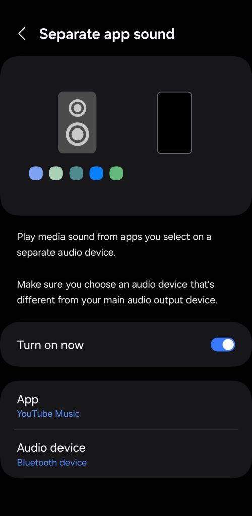 ومع ذلك، مع ميزة Separate app sound من سامسونج، يمكنك تعيين أجهزة إخراج صوت مختلفة لتطبيقات مختلفة. بهذه الطريقة، يمكنك تشغيل YouTube Music من خلال مكبر صوت Bluetooth مع الاستمرار في سماع مقاطع فيديو Instagram Reels من مكبرات الصوت المدمجة في هاتفك. تتيح لك هذه الميزة فصل الصوت حسب التطبيق، مما يوفر تجربة صوتية مخصصة.