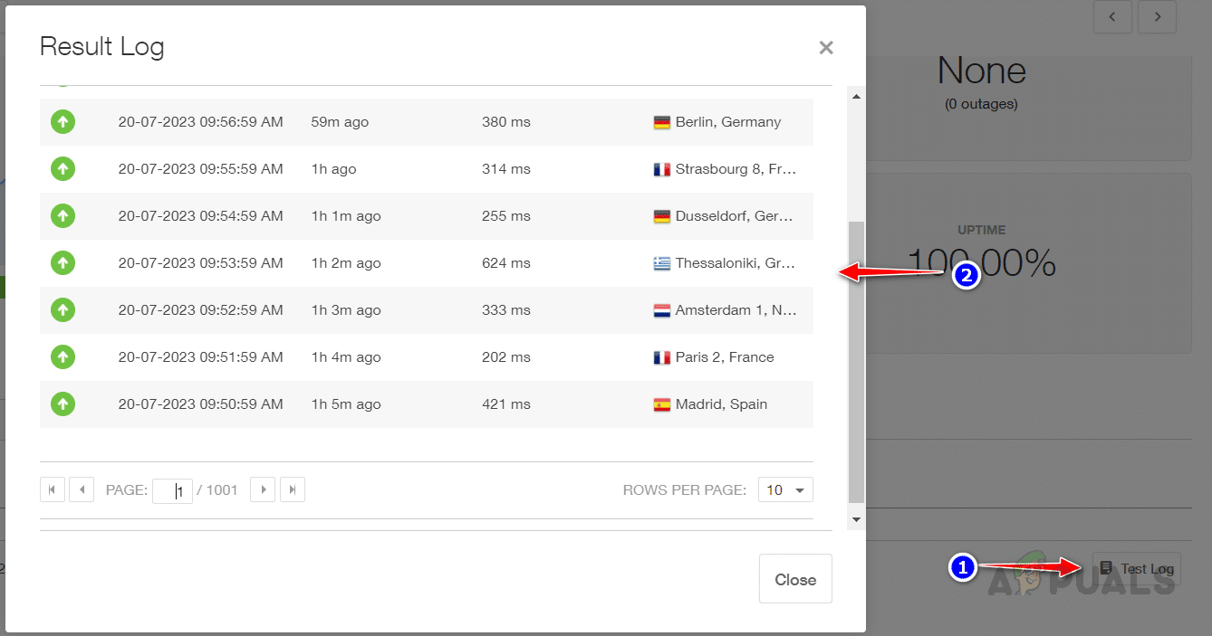 - انقر على سجل الاختبار (Test Log) للتحقق من بيانات وقت التشغيل للموقع من مواقع مختلفة.