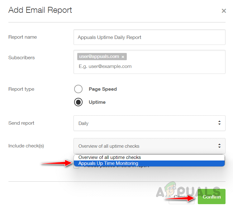 - اختر فحص الموقع الذي ترغب في تضمينه في هذا التقرير، أو اختر عرض نظرة عامة على جميع فحوصات وقت التشغيل لتلقي تقرير شامل عن جميع المواقع. بمجرد الانتهاء، انقر على تأكيد لحفظ الجدول الزمني.