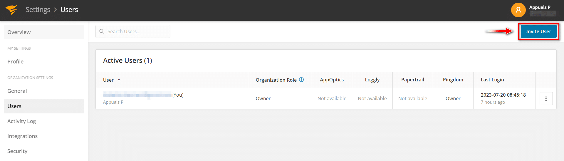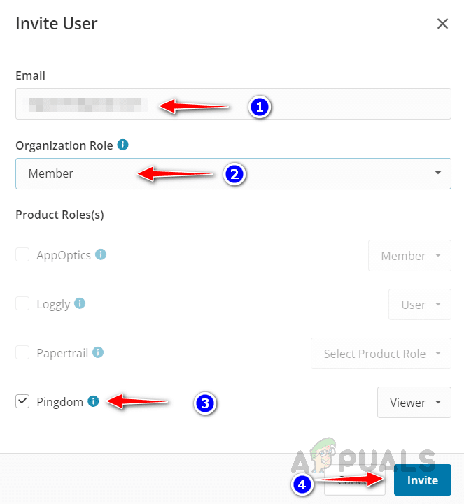 - أدخل عنوان البريد الإلكتروني للمستخدم واختر دور المستخدم، ثم اختر Pingdom وانقر على دعوة.