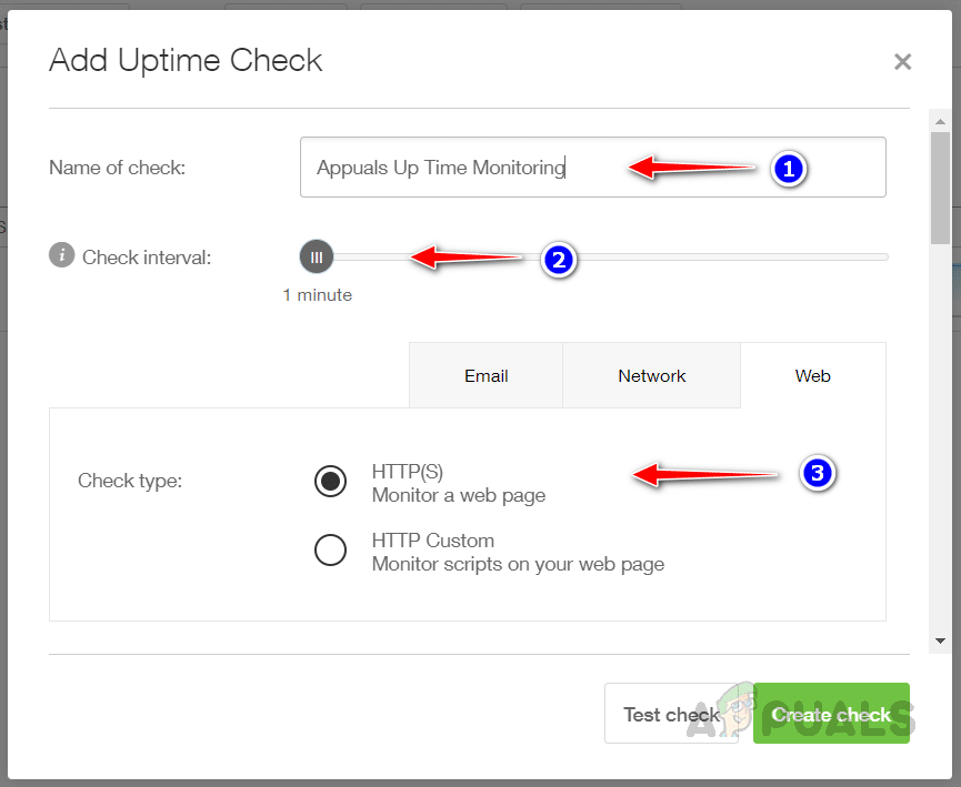 - أدخل اسمًا مناسبًا، ثم حدد فترة الفحص المناسبة عن طريق سحب المؤشر وإفلاته، ثم اختر HTTP أو HTTPS من علامة تبويب الويب بناءً على متطلباتك.
