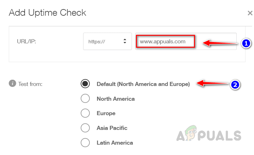 - أدخل URL الذي ترغب في مراقبته واختر المنطقة التي تريد التحقق من توفر الموقع منها. تحتوي كل منطقة على خوادم اختبار متعددة من مواقع مختلفة لاختبار توفر الموقع.