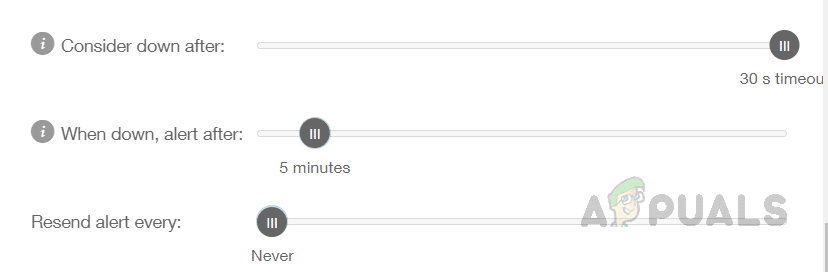 - حدد العتبة باستخدام المؤشر؛ إذا لم يتلقَ Pingdom أي استجابة من الموقع بعد تجاوز هذه العتبة، فإنه يعتبر الموقع معطلاً. اختر بعد كم دقيقة ترغب في تلقي تنبيه إذا كان الموقع معطلاً. يمكنك أيضًا تحديد فترة إعادة إرسال التنبيه.
