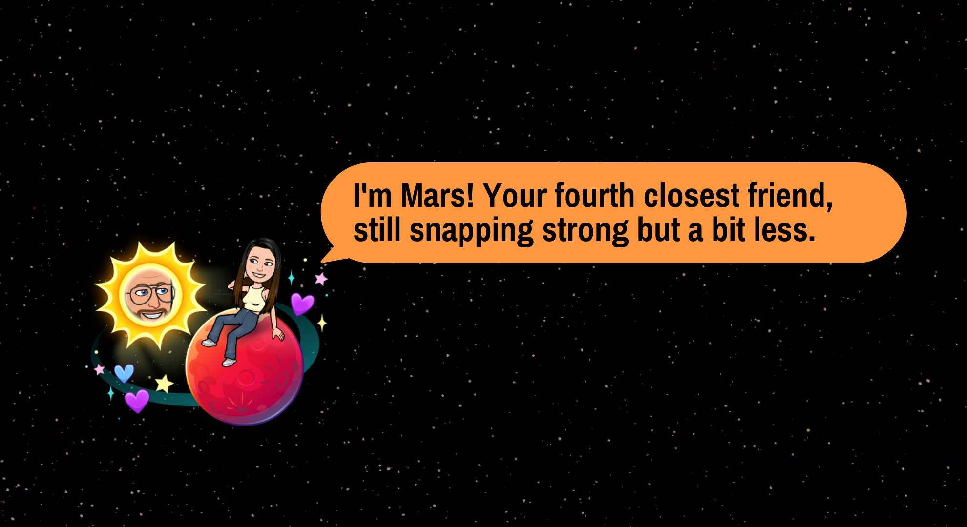 الأرض، الكوكب الثالث من الشمس، يمثل صديقك الثالث الأقرب. يظهر ككوكب أزرق وأخضر مع قمر وقلوب حمراء حوله. لا يزال هذا الصديق قريبًا جدًا، مما يعكس قدرًا جيدًا من التفاعل والـ Snaps المشتركة، مما يجعله جزءًا مهمًا من دائرة أصدقائك على Snapchat.