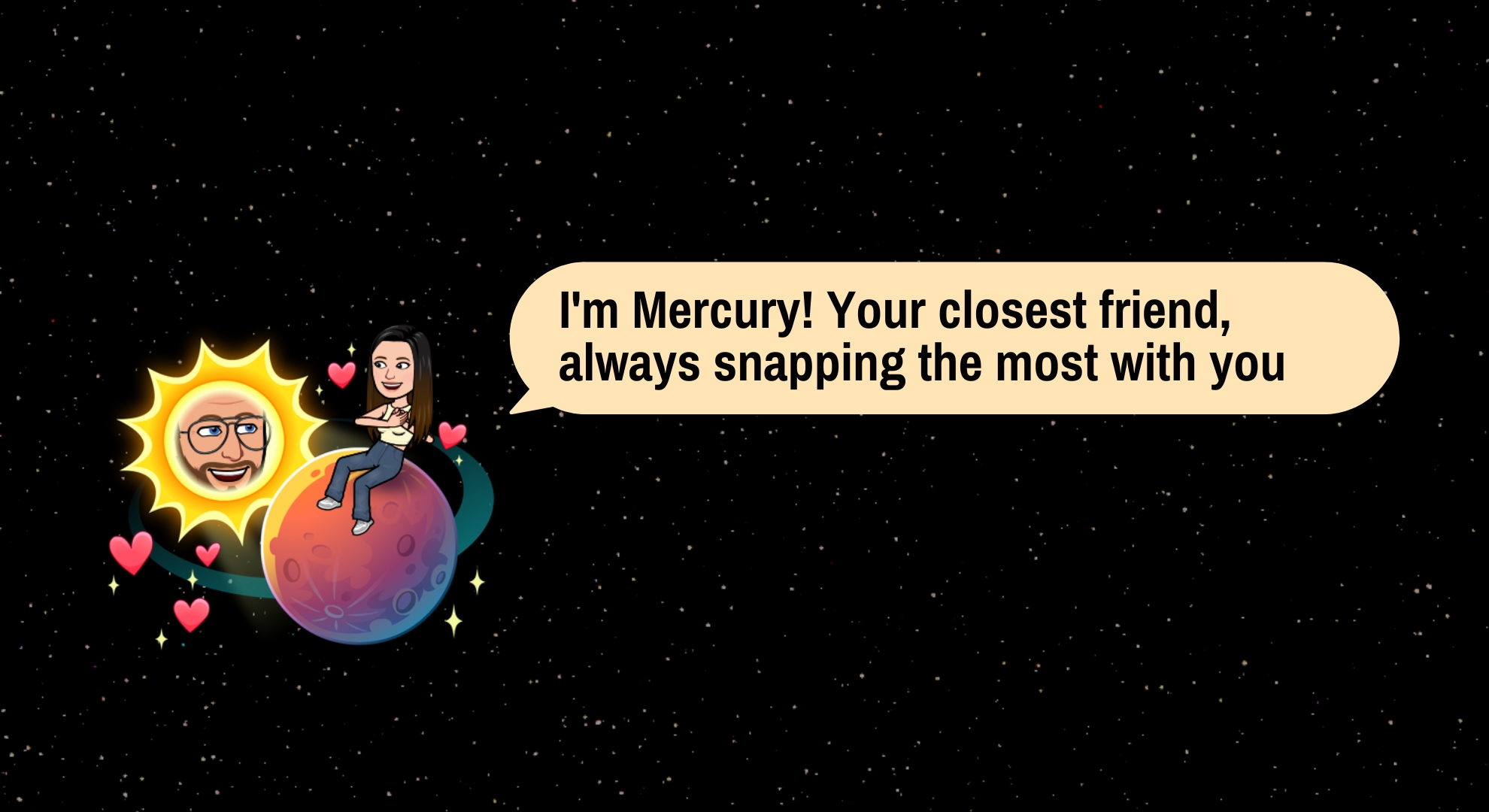 عطارد، أقرب كوكب إلى الشمس، يمثل أفضل صديق لديك على Snapchat. يظهر هذا الكوكب ككوكب أحمر تحيط به عدة قلوب حمراء. إذا تم تخصيص عطارد لشخص ما في نظام الأصدقاء الشمسي الخاص بك، فهذا يعني أنك تشارك معه أكبر عدد من السنابات والرسائل، مما يشير إلى تفاعل قوي ومتكرر.