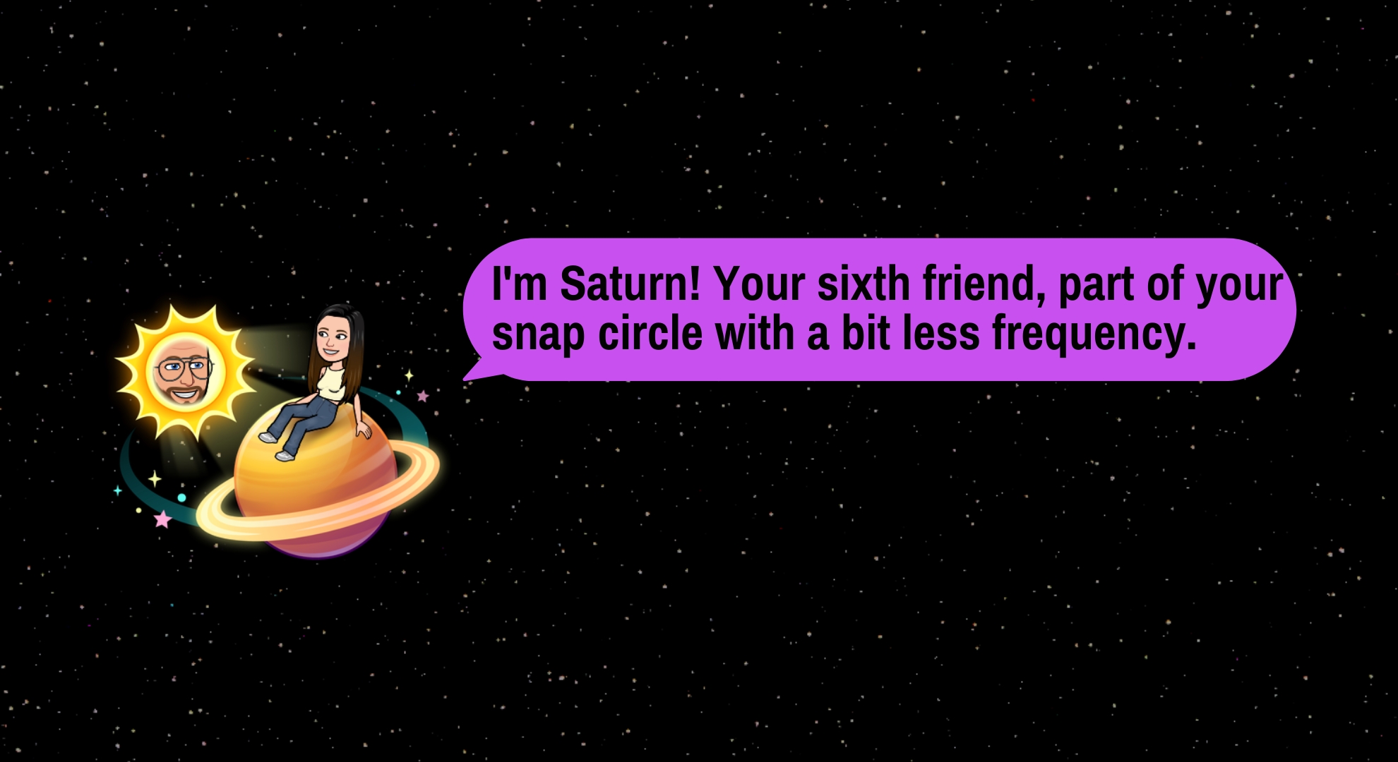 زحل، المشهور بحلقاته، هو الكوكب السادس في نظام Snapchat الشمسي ويرمز إلى صديقك السادس الأقرب. يُصوَّر ككوكب برتقالي اللون مع حلقة ونجوم حوله. هذا الصديق جزء من دائرة تفاعلك المنتظمة، ولكن بتواصل أقل تكرارًا من الأصدقاء الخمسة الأوائل.