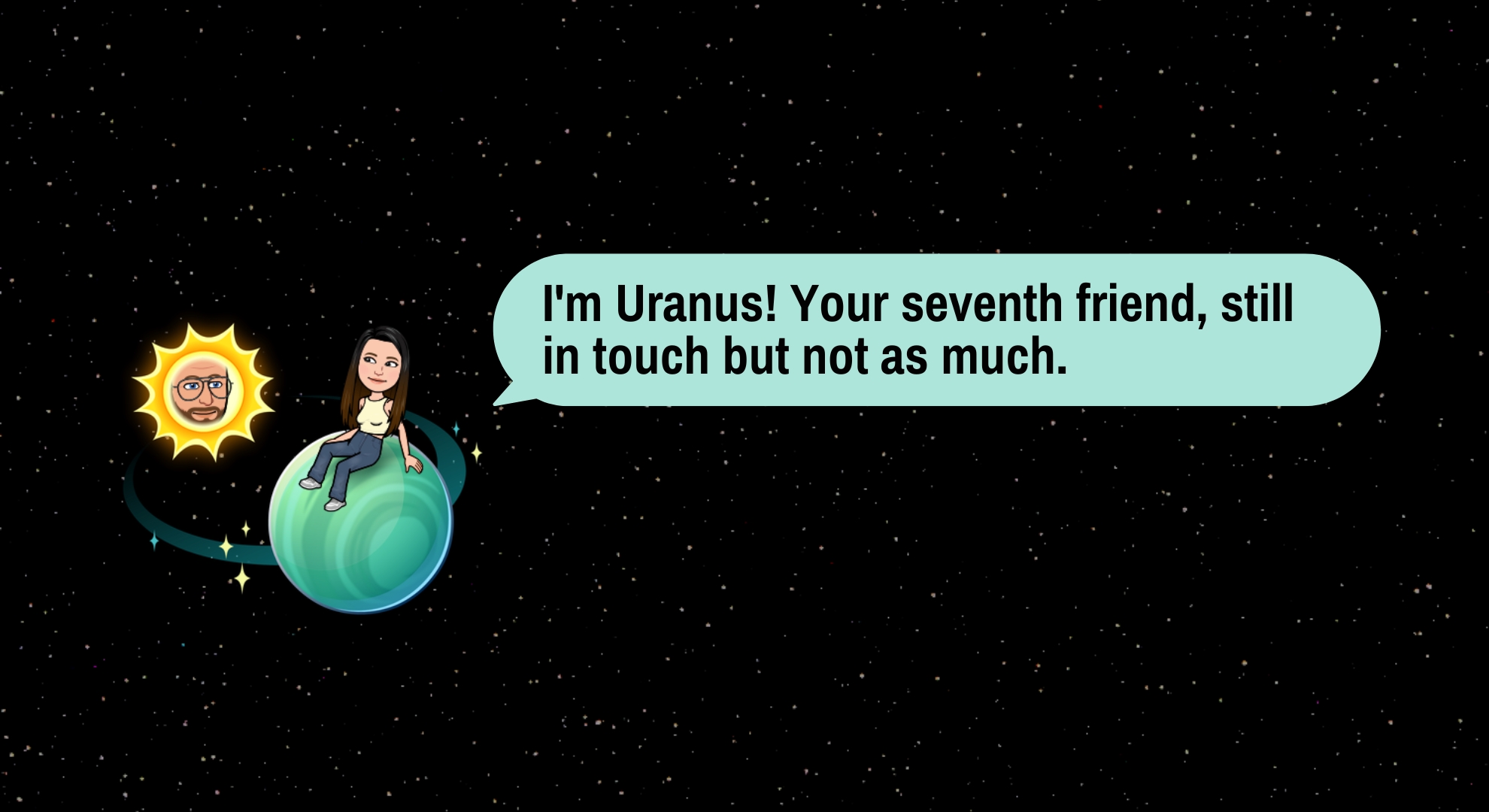 أورانوس يمثل صديقك السابع الأقرب ويظهر ككوكب أخضر اللون مع نجوم حوله. يشير هذا إلى تفاعل أبعد ولكنه لا يزال مهمًا ضمن دائرتك الاجتماعية، موضحًا أنك تشارك اللقطات والرسائل، ولكن ليس بنفس تكرار الكواكب الأقرب.