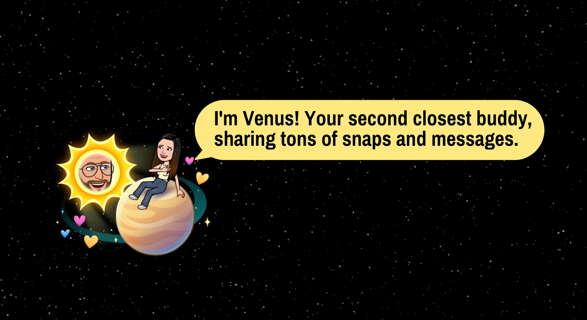 الزهرة هو الكوكب الثاني في نظام Snapchat الشمسي ويرمز إلى صديقك الثاني الأقرب. يظهر ككوكب بلون بيج تحيط به قلوب وردية وصفراء وزرقاء. تتفاعل مع هذا الصديق بقدر كبير يضاهي تفاعلك مع صديقك الأول تقريبًا، حيث تشاركان قدرًا كبيرًا من التواصل والسنابات.