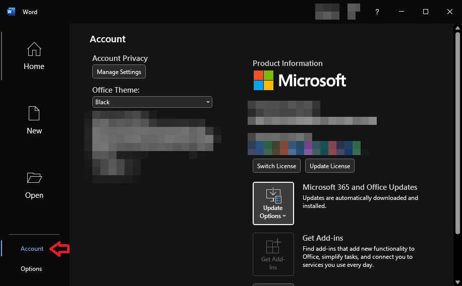 - افتح أي تطبيق من تطبيقات Office (مثل Excel أو Word) وانتقل إلى قائمة الحساب.
