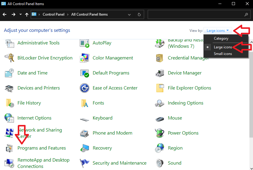 - انقر على القائمة المنسدلة “عرض حسب” وحدد أيقونات كبيرة. ثم انقر على البرامج والميزات.
