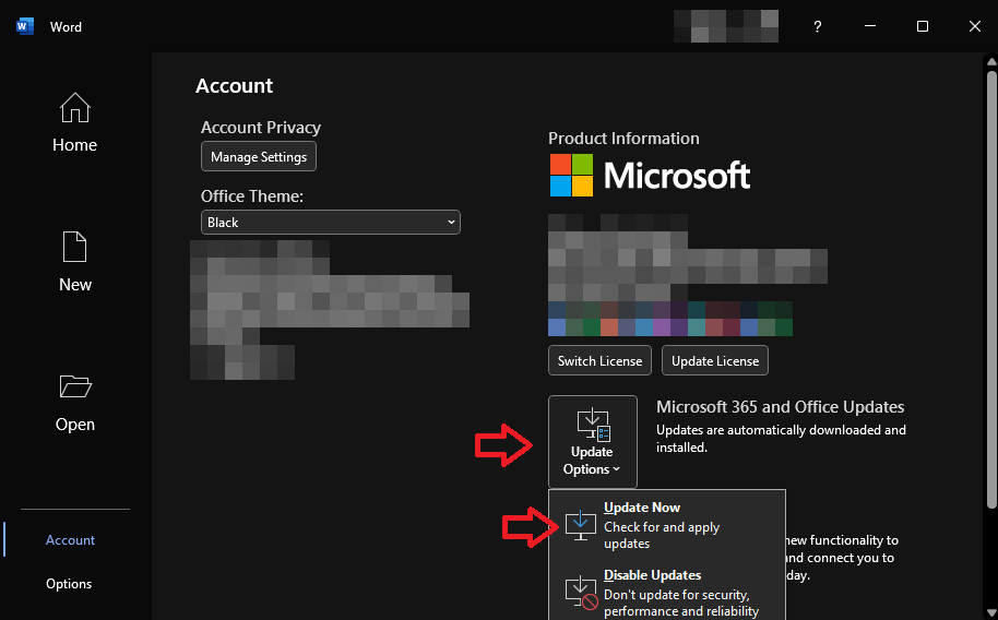 - انقر فوق خيارات التحديث واختر ‘تحديث الآن’ لتحديث Office يدويًا.
