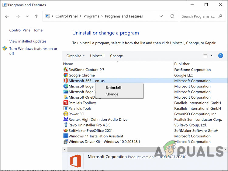 - يجب أن تعرض شاشتك الآن قائمة بالبرامج المثبتة. ابحث عن Office 365 وانقر عليه بزر الماوس الأيمن.