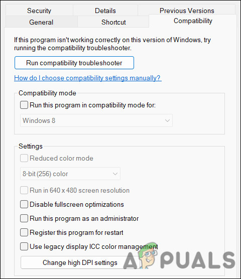 - في مربع الحوار التالي، انتقل إلى علامة التبويب التوافق (Compatibility) وإذا كانت أي مربعات محددة هناك، قم بإلغاء تحديدها.