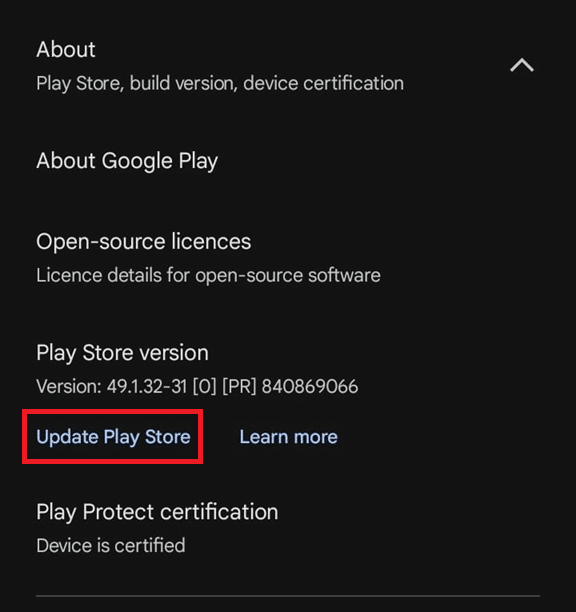 - انقر على تحديث Play Store.