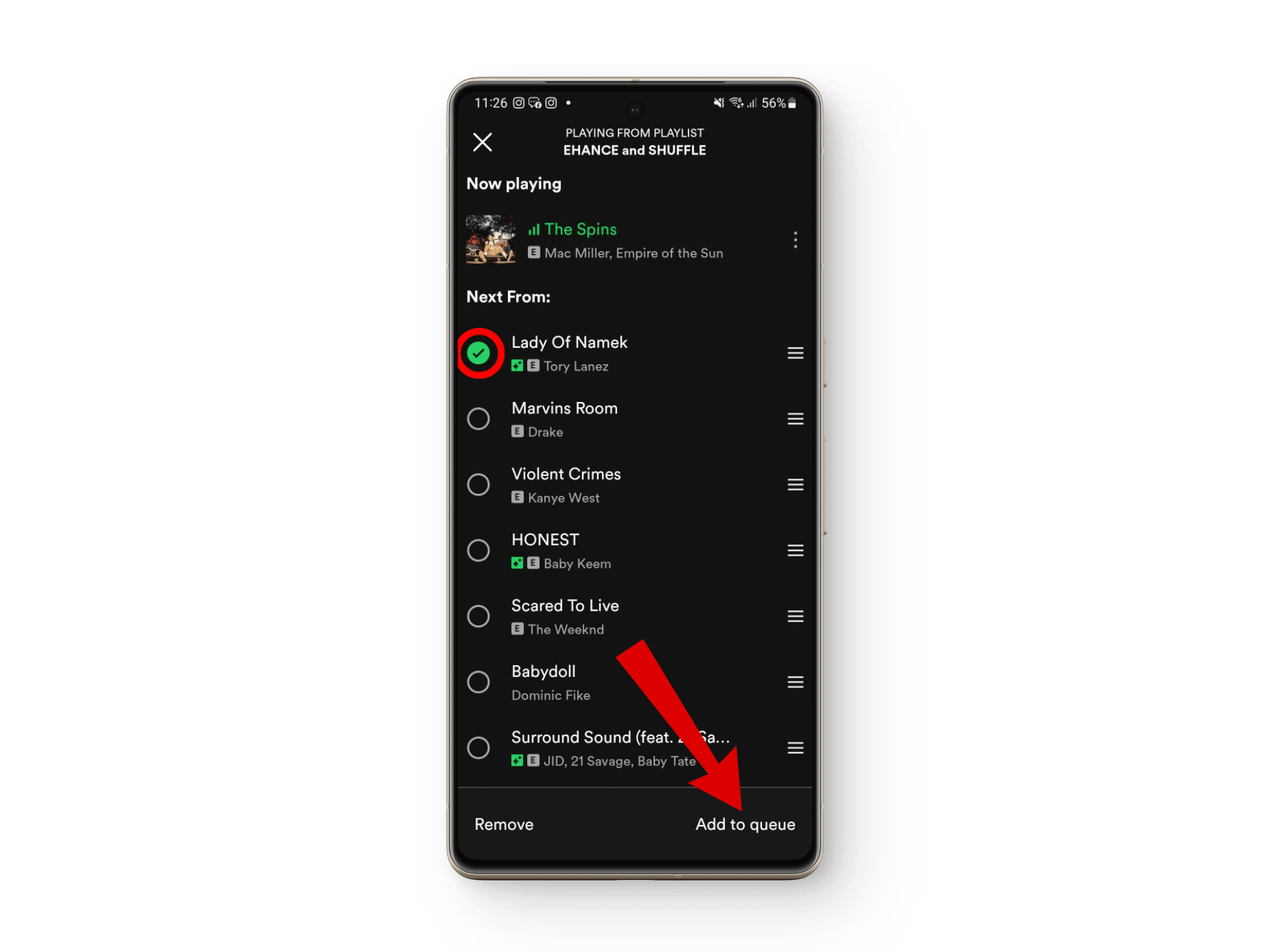 عادةً ما توجد الأغاني الموصى بها بواسطة Spotify Smart Shuffle في قائمة انتظار الموسيقى الخاصة بك، وإضافتها إلى قائمة التشغيل الخاصة بك أمر بسيط. إليك كيفية إضافة أغاني Smart Shuffle إلى قائمة التشغيل الخاصة بك: