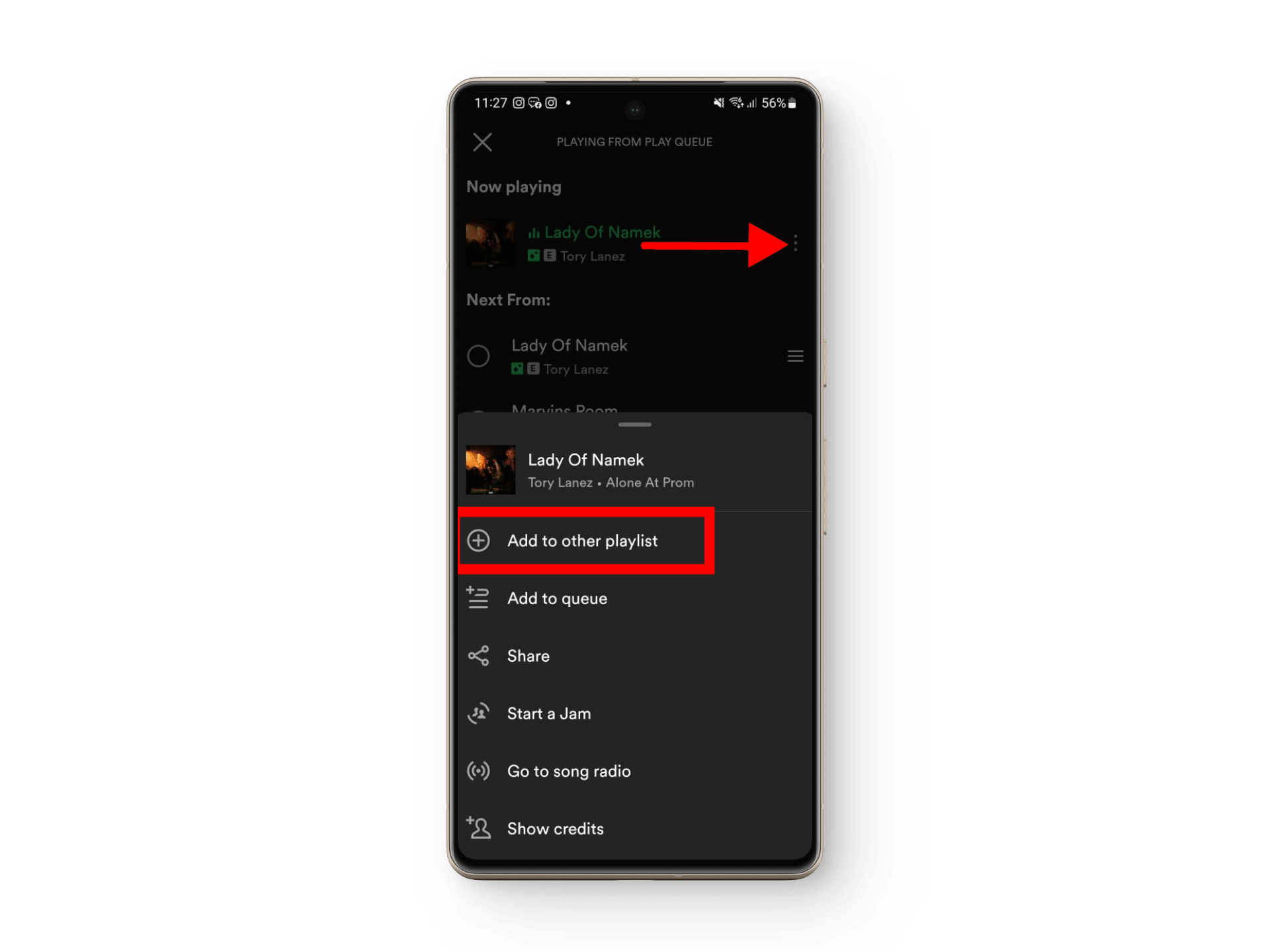 - عند تشغيل الأغنية، اضغط على النقاط الرأسية الثلاث بجانبها، ثم اختر إضافة إلى قوائم تشغيل أخرى.