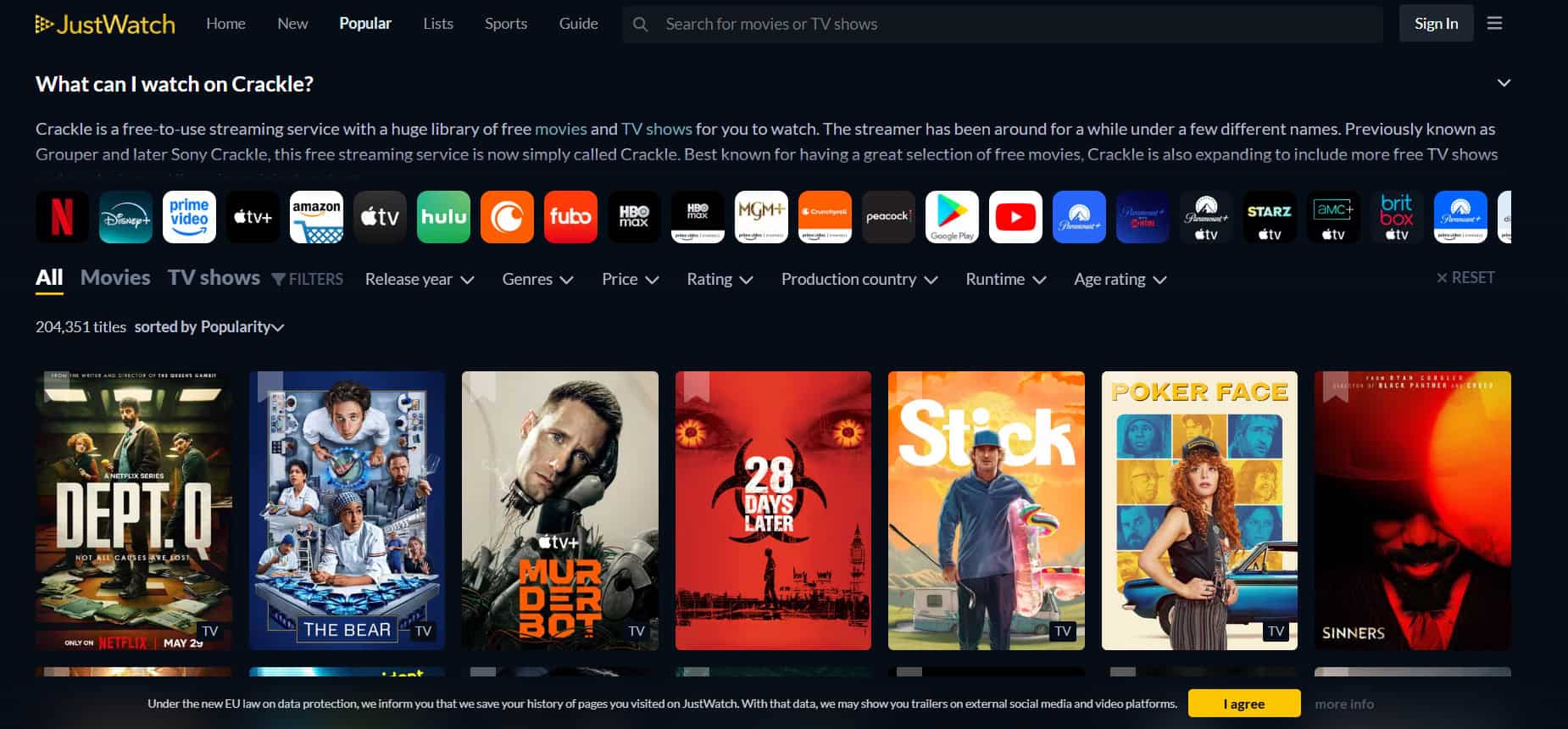 بدعم من Sony، يُعد Crackle بديلاً شرعيًا وغنيًا لـ Flixtor. يستضيف آلاف العناوين ولديه تطبيقه الخاص، مما يمنح المستخدمين الكثير من الخيارات دون الحاجة إلى حساب. ومع ذلك، فإن تقنية حظر VPN الخاصة به قوية؛ فقط شبكات VPN عالية المستوى مثل NordVPN أو Surfshark يمكنها تجاوزها. حتى مع وجود بعض الإعلانات، فإن المنصة قابلة للاستخدام وآمنة للغاية. إذا كنت تريد بثًا موثوقًا به بعيدًا عن المحتوى المشبوه، فإن Crackle خيار قوي كأحد أفضل بدائل Flixtor.