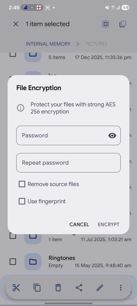 على عكس المجلدات المخفية القياسية، يستخدم Solid Explorer تشفير AES-256.