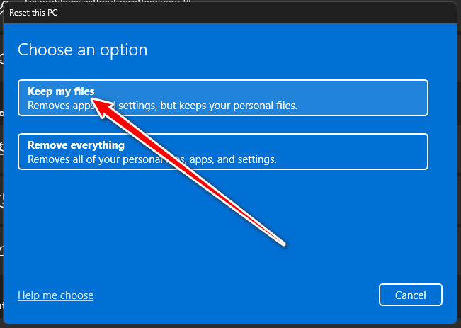 - حدد الاحتفاظ بملفاتي للاحتفاظ ببياناتك أثناء إعادة تثبيت ملفات النظام.