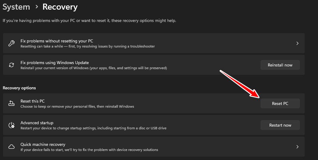 إذا استمرت المشكلة، فإن إعادة تعيين جهاز الكمبيوتر الخاص بك يمكن أن يعيد بناء مكونات Windows الأساسية ويعيد تثبيت وحدات .NET Framework تلقائيًا. يُعد هذا الخيار أكثر أمانًا من إعادة التثبيت الكامل ويسمح لك بالاحتفاظ بملفاتك الشخصية سليمة.