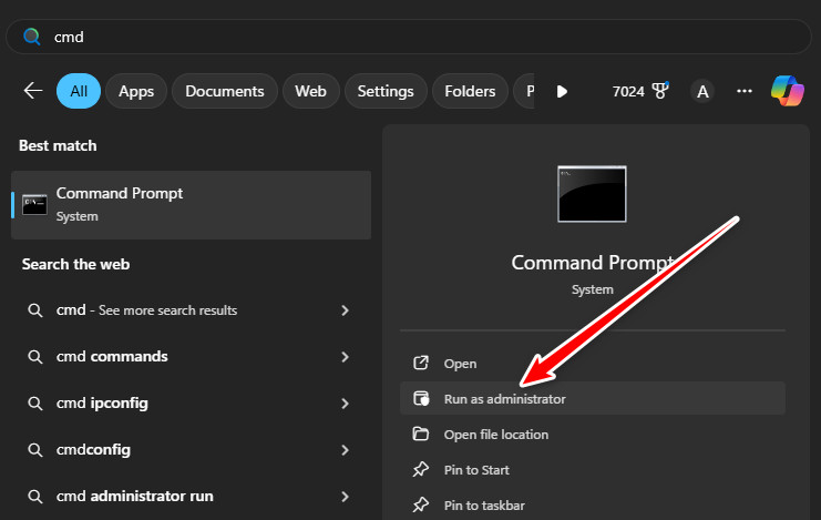 - انقر بزر الماوس الأيمن على موجه الأوامر واختر تشغيل كمسؤول.