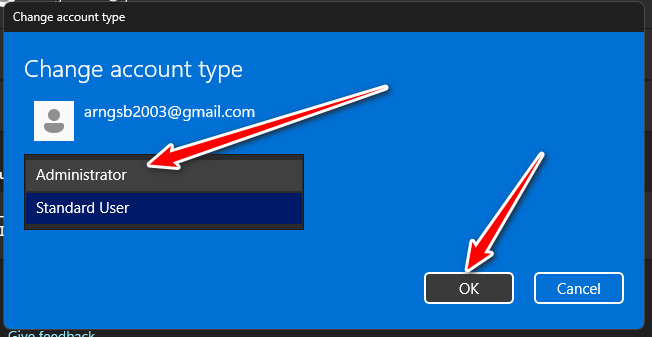 - بعد الإنشاء، حدد المستخدم الجديد واختر تغيير نوع الحساب.