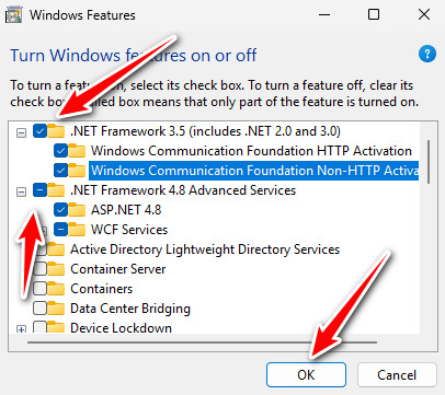 - حدد كلا المربعين (بما في ذلك جميع الخيارات الفرعية)، ثم انقر فوق موافق ودع Windows يقوم بتثبيت المكونات المطلوبة.