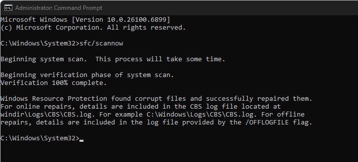 إذا كانت ملفات .NET Framework تالفة أو مفقودة، فقد يكتشفها Windows بشكل خاطئ على أنها مثبتة. يضمن تشغيل فحص مدقق ملفات النظام (SFC) التحقق من جميع الملفات المحمية، بما في ذلك مكونات .NET، واستبدالها تلقائيًا عند الحاجة.
