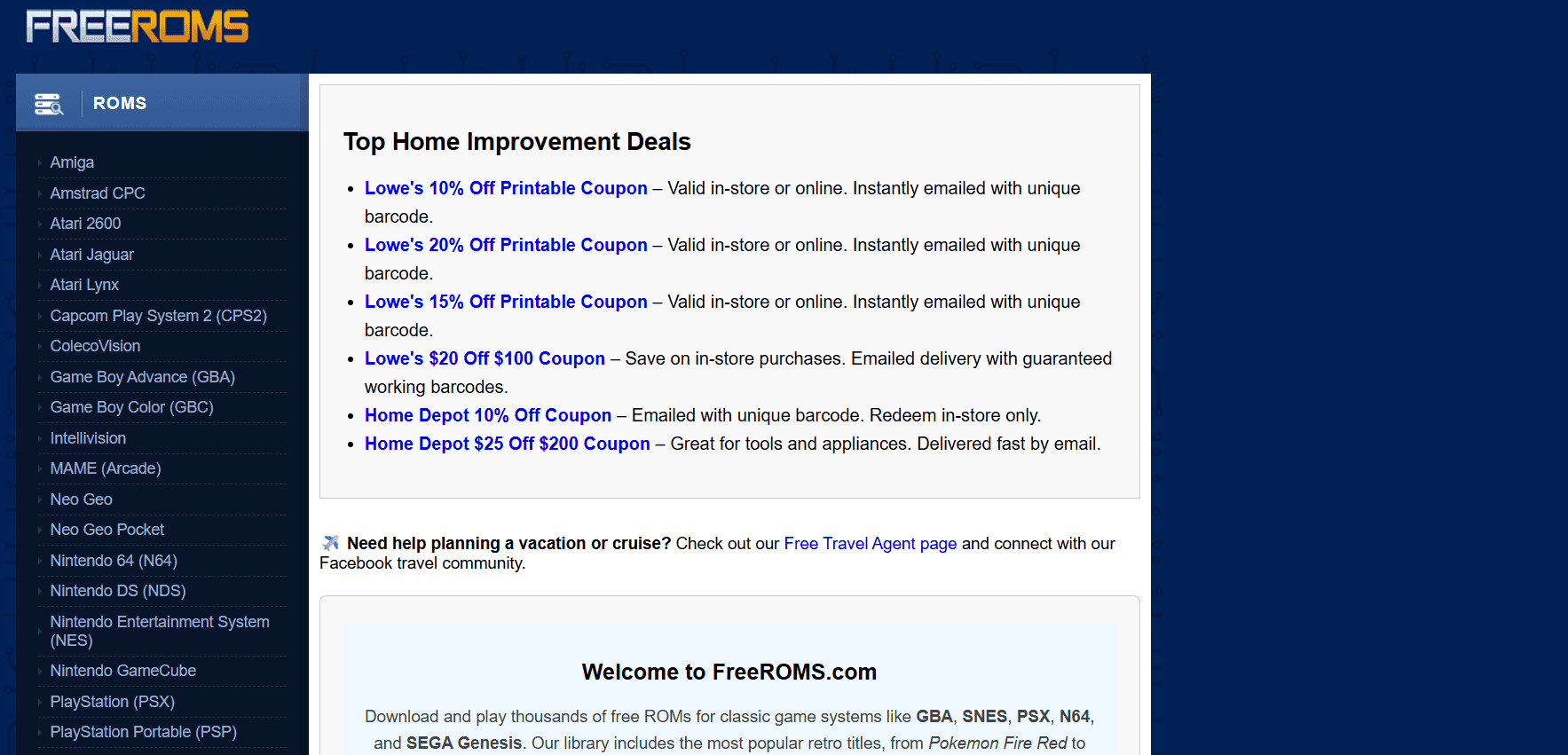 إذا كنت ترغب في الوصول السريع إلى ملفات ROMs القديمة، يقدم FreeROMS طريقة تنزيل سهلة ومباشرة للألعاب من Amiga إلى SNES. تتضمن صفحة كل لعبة روابط لمُحاكيات متوافقة، ويمكنك التصفية حسب الشعبية أو التقييم أو الأصوات. على الرغم من وجود بعض الإعلانات المتناثرة، إلا أن معظمها سهل التجنب. يمكنك الاختيار بين التنزيلات المباشرة والبديلة للحصول على اللعبة التي تحتاجها.