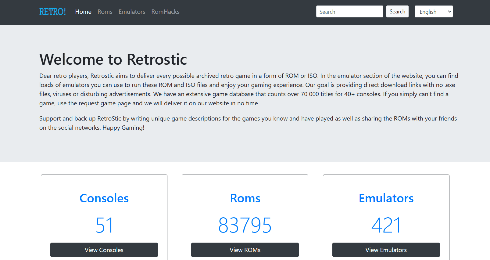 تبرز EmuROMS كواحدة من أكثر الأماكن موثوقية للحصول على ملفات ROM بأمان. بدلاً من التورنت، تُقدم التنزيلات الآن مباشرة كملفات ZIP نظيفة. يقوم نظام البحث الخاص بهم بتصفية النتائج بدقة حسب أجهزة الألعاب مثل Sega Genesis و Xbox 360 والمزيد، مما يسهل العثور على ما تبحث عنه بالضبط. في صفحة كل لعبة، ستجد لقطات شاشة مفيدة لمعاينة طريقة اللعب. بالإضافة إلى ذلك، توفر العديد من ملفات ROM خيار اللعب عبر المتصفح، لذا لا حاجة لمُحاكي، مما يجعلها واحدة من أفضل مواقع ROM الآمنة لتنزيل الألعاب!