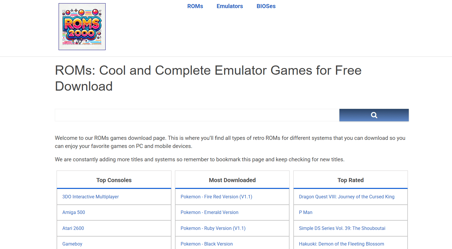 كان ROMS2000، المعروف سابقًا باسم Romsie، يمتلك مكتبة قوية من الألعاب القابلة للتنزيل مع واجهة سهلة الاستخدام. يساعد شريط بحث كبير في الأعلى على العثور على ألعابك المفضلة بسرعة، بينما يتم عرض ملفات ROMs الشائعة وأفضل أجهزة الكونسول أدناه. بمجرد الوصول إلى صفحة اللعبة، تحصل نقرة على زر التنزيل على ملف مضغوط (zip) يحتوي على ملف ROM بالداخل. فقط كن على دراية بالسرعات البطيئة العرضية — يمكن أن يساعد استخدام مدير تنزيل.