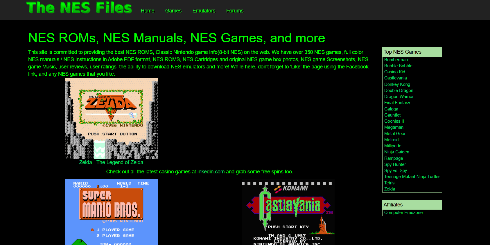 سيحب عشاق NES موقع The NES Files، وهو موقع ROM مخصص يركز بالكامل على ألعاب Nintendo الكلاسيكية. لا يوجد شريط بحث، ولكن جميع ملفات ROMs مدرجة في صفحة واحدة. أو يمكنك ببساطة استخدام وظيفة البحث في متصفحك للعثور على ما تفضله. يمكنك أيضًا تنزيل ملفات الموسيقى ورموز الغش لكل لعبة، مما يجعله كنزًا ثمينًا للحنين للاعبين الكلاسيكيين.