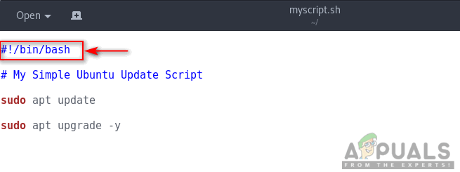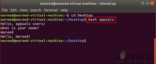 ملاحظة: يمكن أن يكون اسم الملف أي شيء. هنا قمنا بتسمية ملف السكربت “appuals” بدون أي امتداد. تأكد أيضًا من أنك في الدليل الصحيح حيث يوجد الملف.