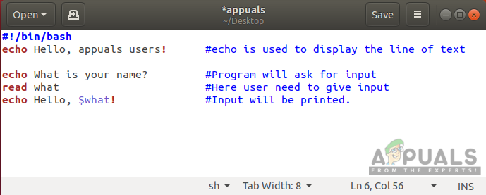 2. الآن اكتب الكود النموذجي التالي واحفظه بامتداد sh أو بدونه: