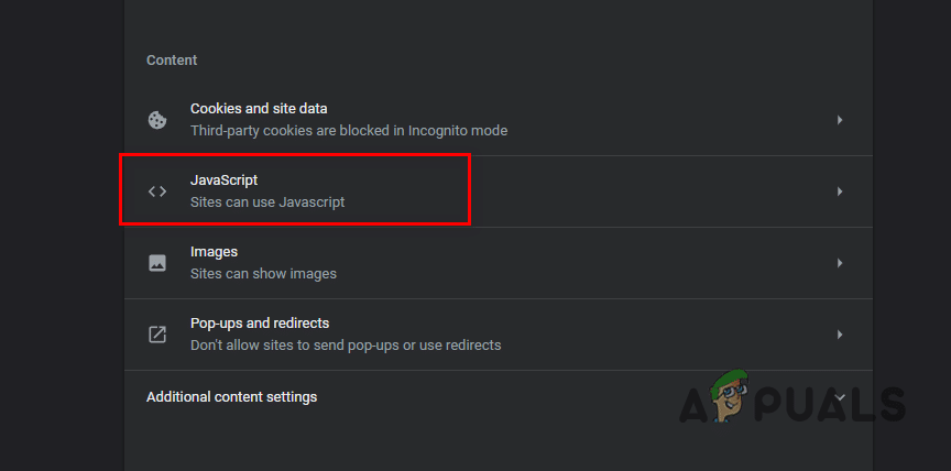 - انقر على JavaScript، والذي يوجد تحت عنوان المحتوى في الأسفل