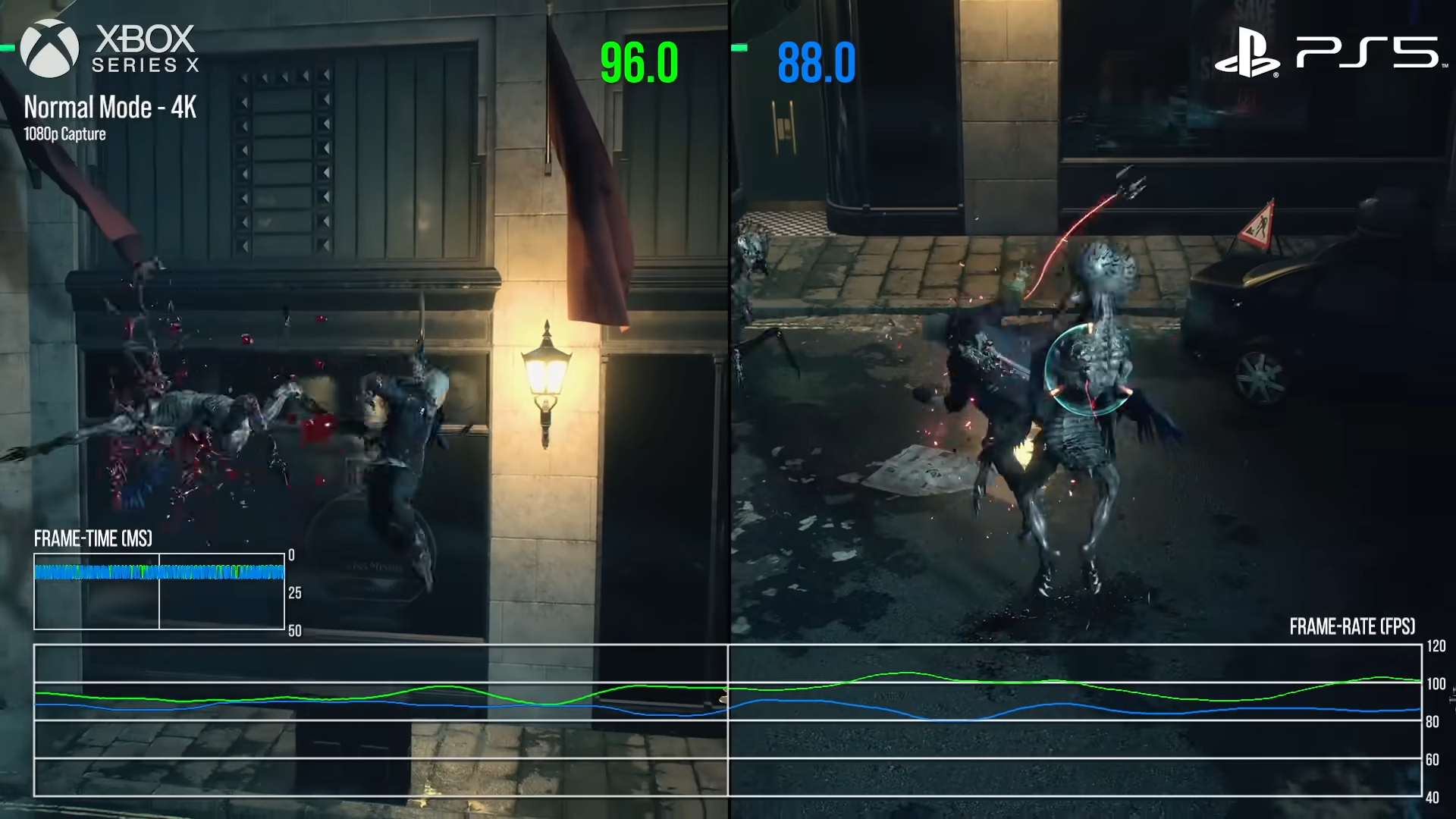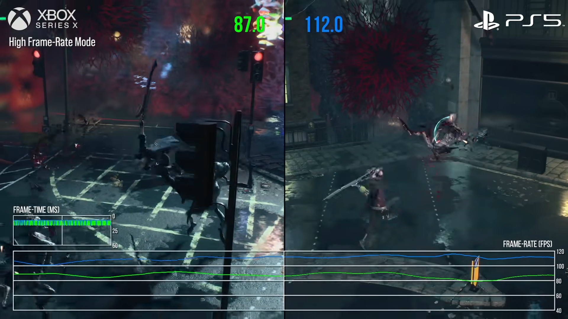 تُظهر الصورة الأولى اللعبة وهي تعمل في وضعها “العادي” حيث تتفوق Series X بفارق طفيف في عدد الإطارات في الثانية (FPS). ولكن في الصورة الثانية التي تعرض اللعبة وهي تعمل في وضع “معدل الإطارات المرتفع“، تتفوق PS5 بفارق جيد، على الرغم من امتلاكها لوحدة معالجة رسوميات أضعف وبعدد TFLOPS أقل.
