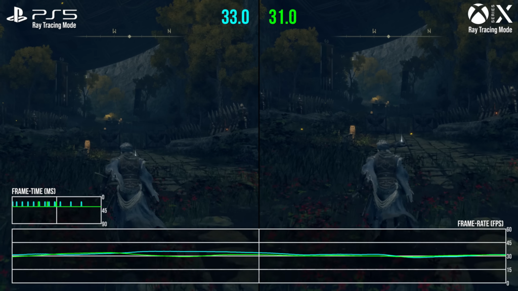 الآن، انظر إلى الصورة أدناه التي تعرض لعبة أحدث وأكثر تطلبًا بكثير، وهي “Elden Ring“، تعمل على كلا الجهازين. مرة أخرى، ترى كيف أن PS5 تشغل اللعبة بشكل أفضل قليلاً هنا مع عدد إطارات في الثانية (FPS) أعلى وأكثر اتساقًا، مما يثبت أن وحدة معالجة الرسوميات الخاصة بها بقوة 10.3 TFLOPS (مثلها مثل أي وحدة معالجة رسوميات أخرى) ليست مؤشرًا على الأداء الفعلي في العالم الحقيقي.