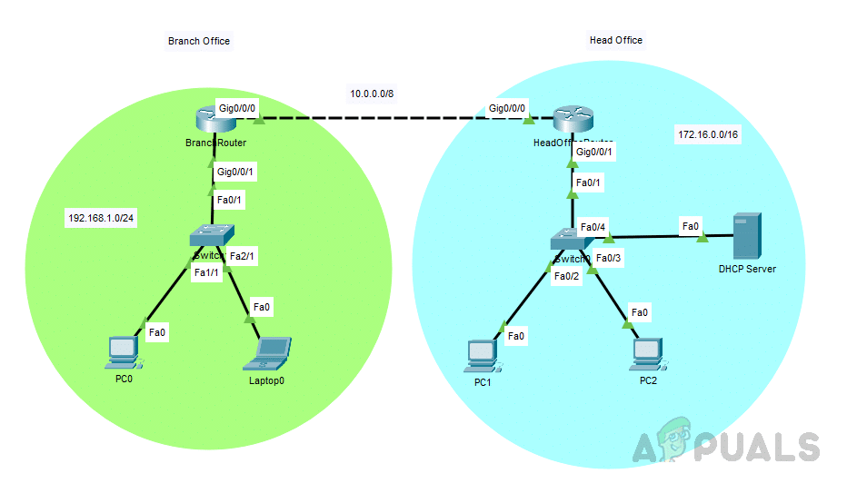 دعنا نستخدم السيناريو التالي لهذا العرض التوضيحي. تتكون هذه البنية البسيطة من مكتب رئيسي يضم موجهًا (router) ومحولًا (switch) وخادم DHCP وأجهزة كمبيوتر للمستخدمين، ومكتب فرعي يضم موجهًا ومحولًا وأجهزة كمبيوتر للمستخدمين.