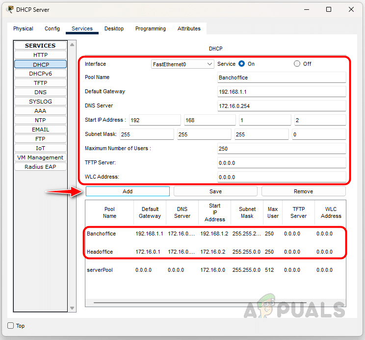 2. لإعداد تجمع DHCP، امنحه اسمًا مناسبًا، واضبط البوابة الافتراضية، وعنوان IP البدائي، والتفاصيل الضرورية الأخرى. لتمكين الخدمة، حدد زر الاختيار “تشغيل“، ثم انقر على “إضافة“.