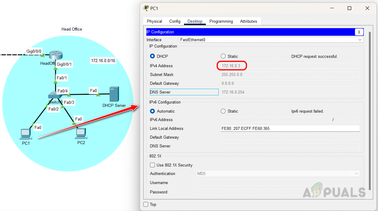 تلقى جهاز الكمبيوتر PC1 من شبكة المكتب الرئيسي عنوان IP من خادم DHCP.