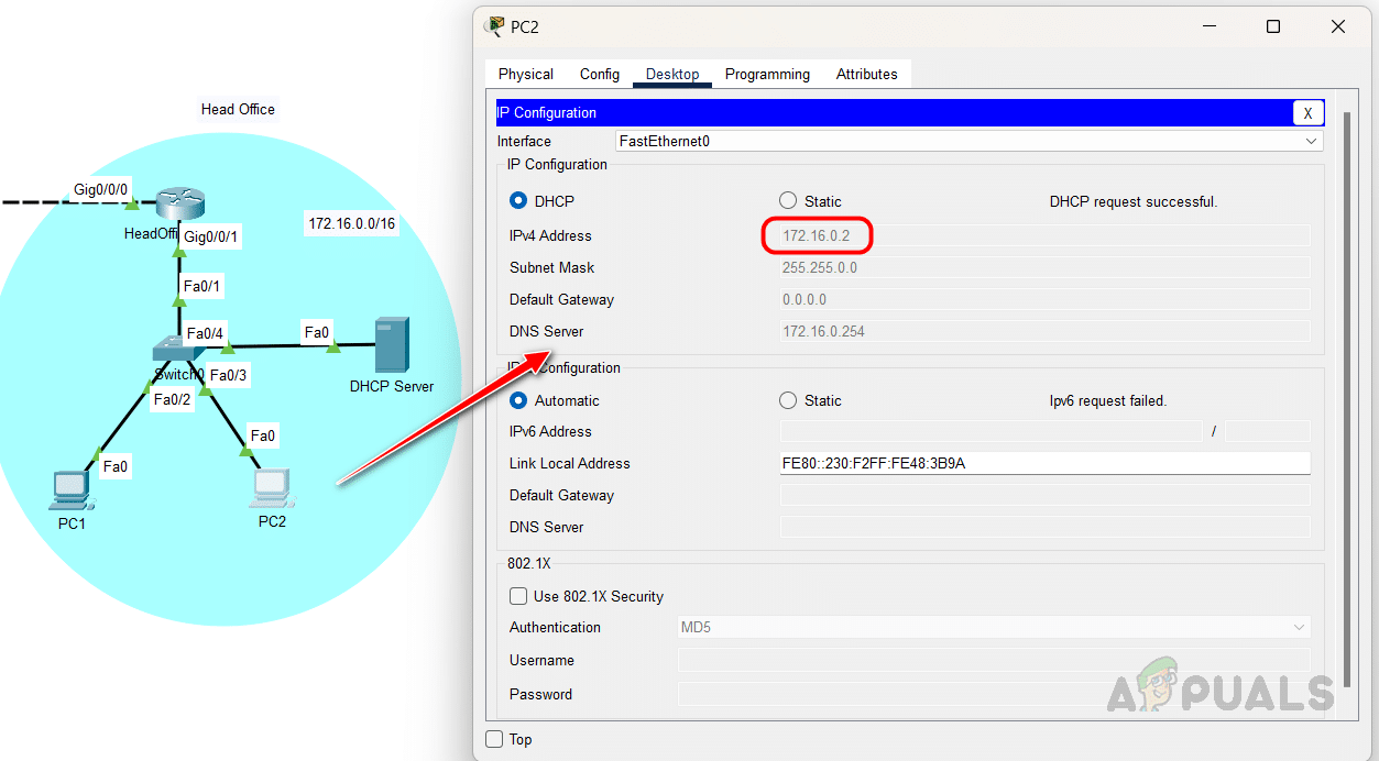 تلقى الجهاز PC2 أيضًا عنوان IP من خادم DHCP.