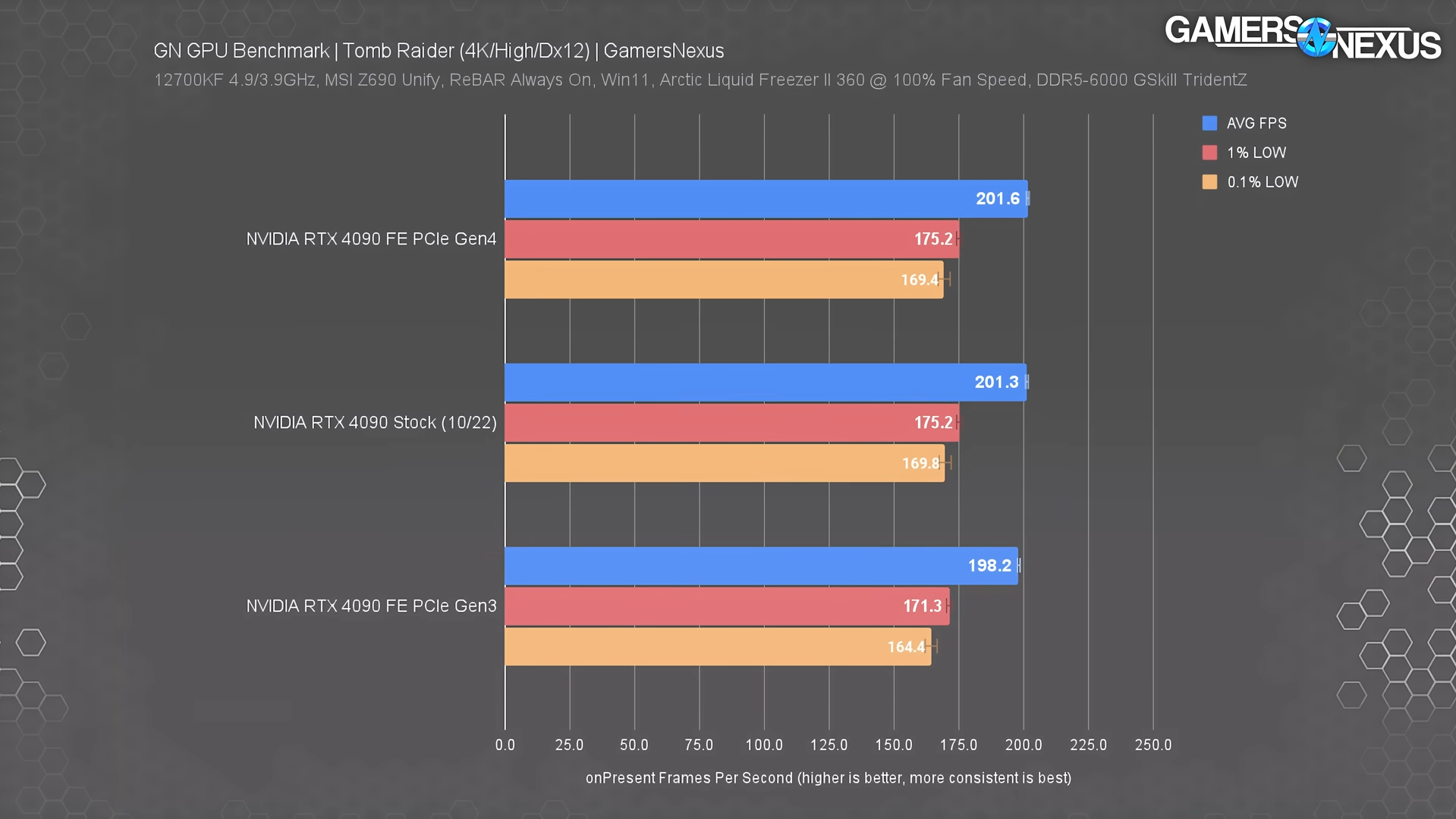 أجرى Gamer’s Nexus اختبارات ووجد أنه على الرغم من اختلاف عرض النطاق الترددي بمقدار ضعفين، تحسن معدل الإطارات (FPS) بشكل هامشي بنسبة 2-3% فقط بين الجيل الثالث والجيل الرابع. وغني عن القول، سيكون PCIe Gen 5.0 تحسنًا أصغر.