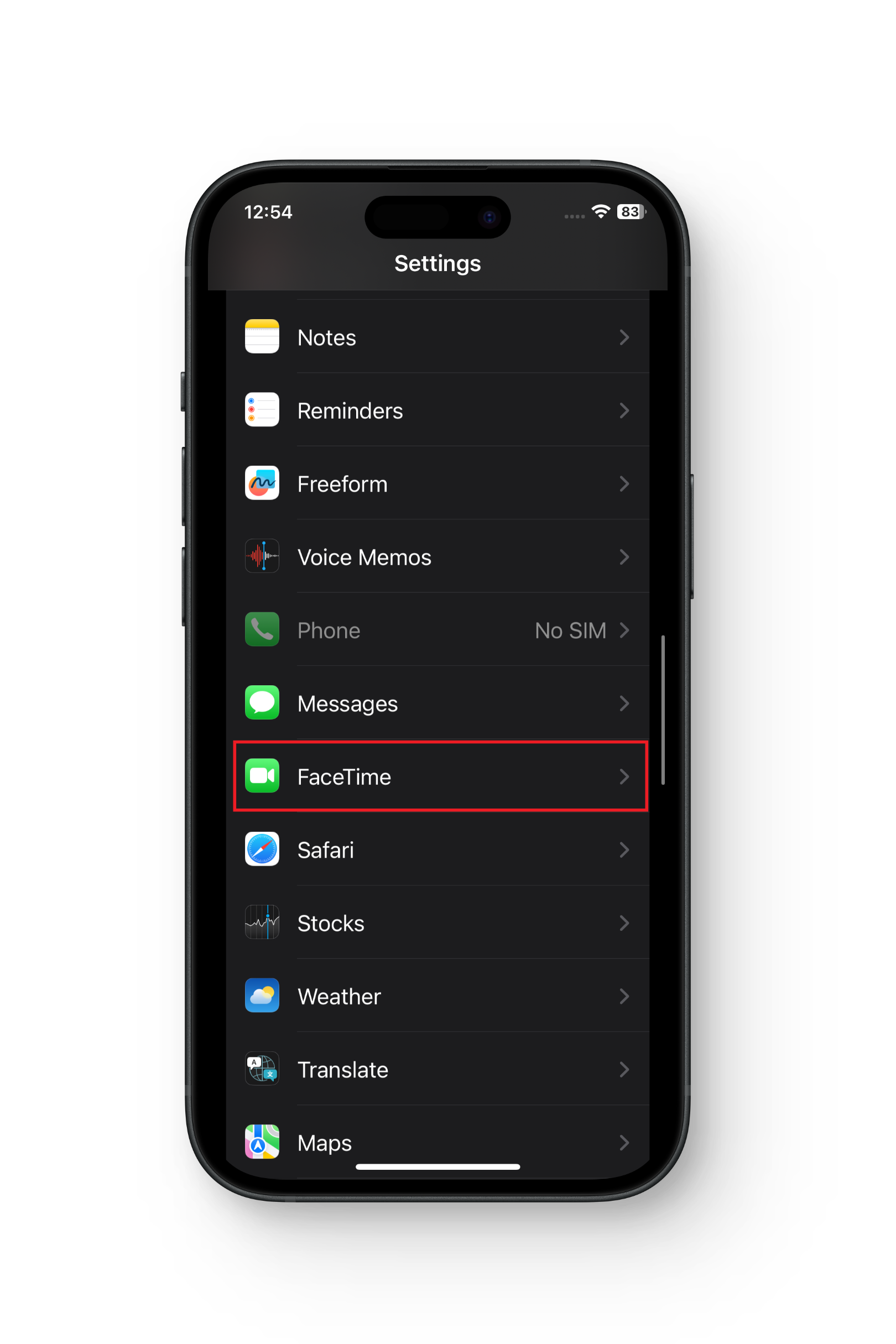 - مرر لأسفل واضغط على “FaceTime“.