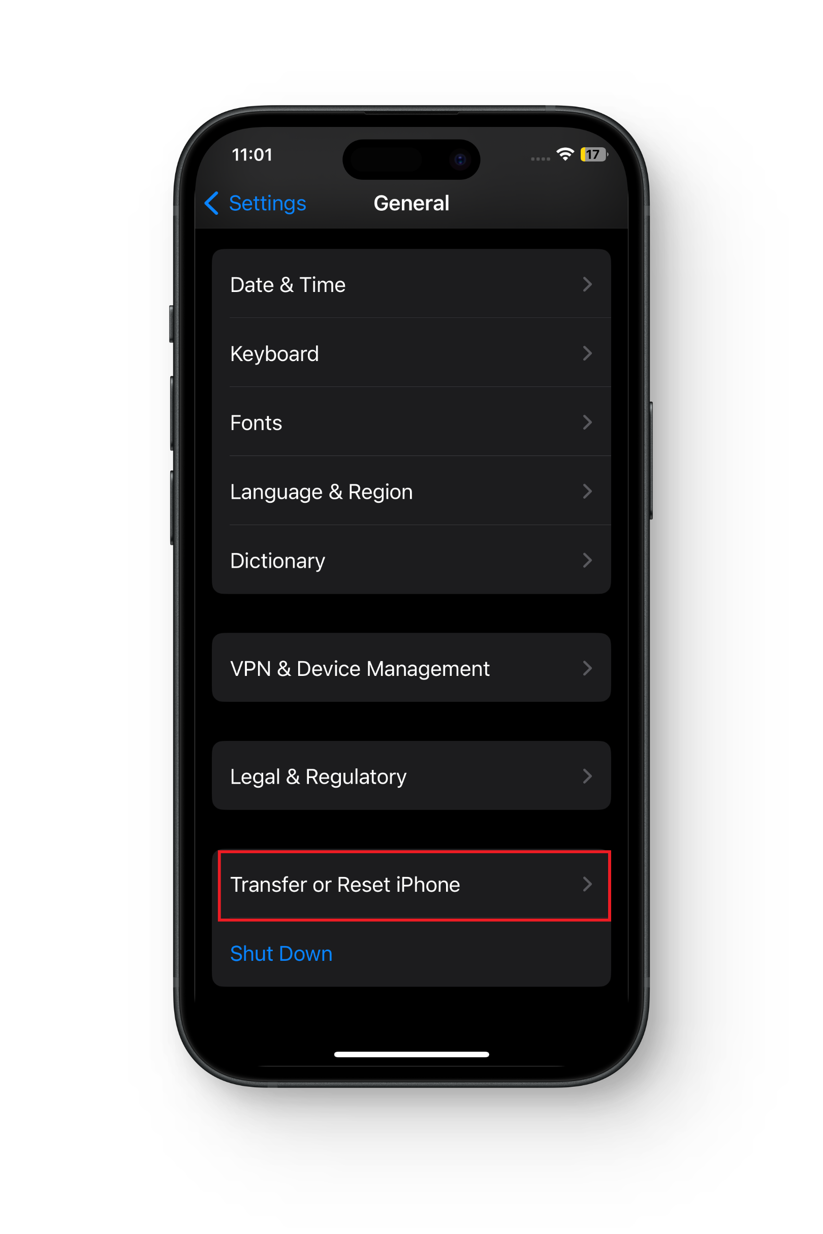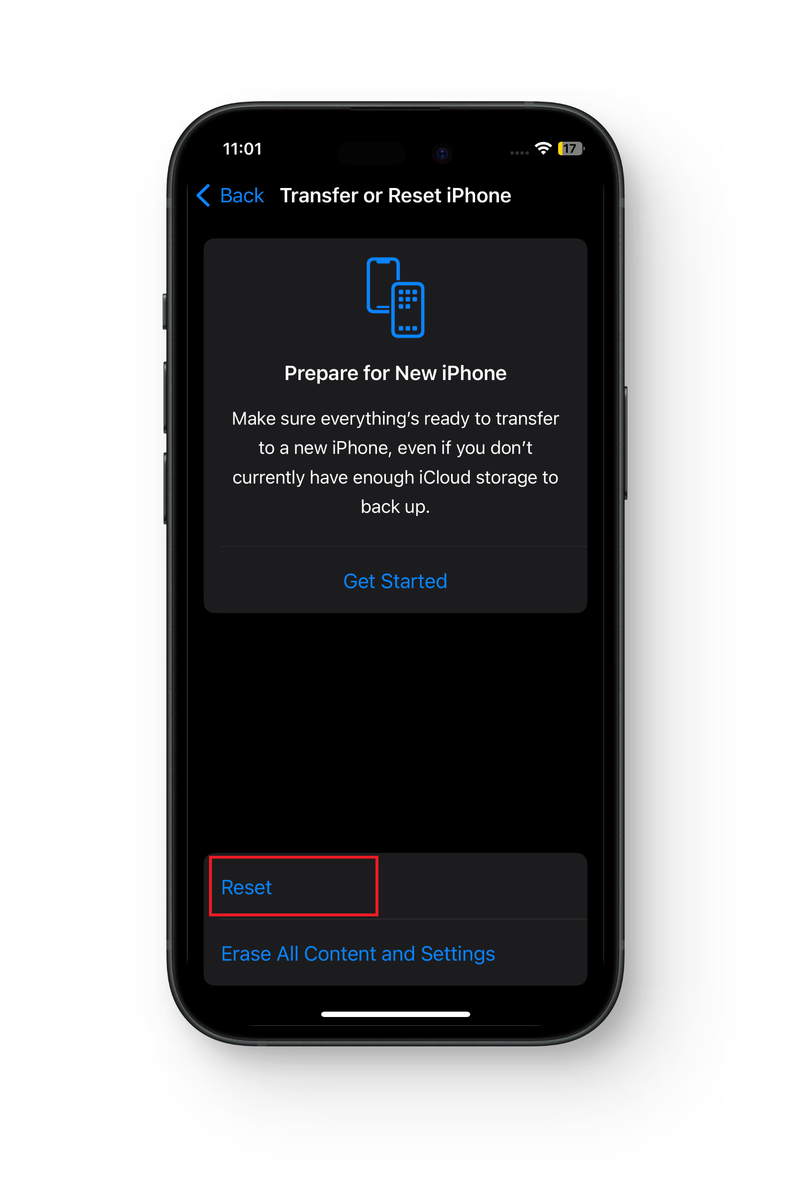 - انتقل إلى “الإعدادات” > “عام” > “نقل أو إعادة تعيين iPhone”.