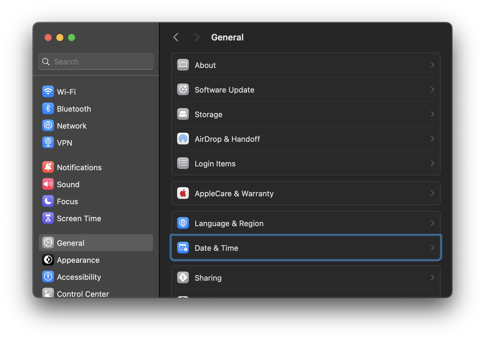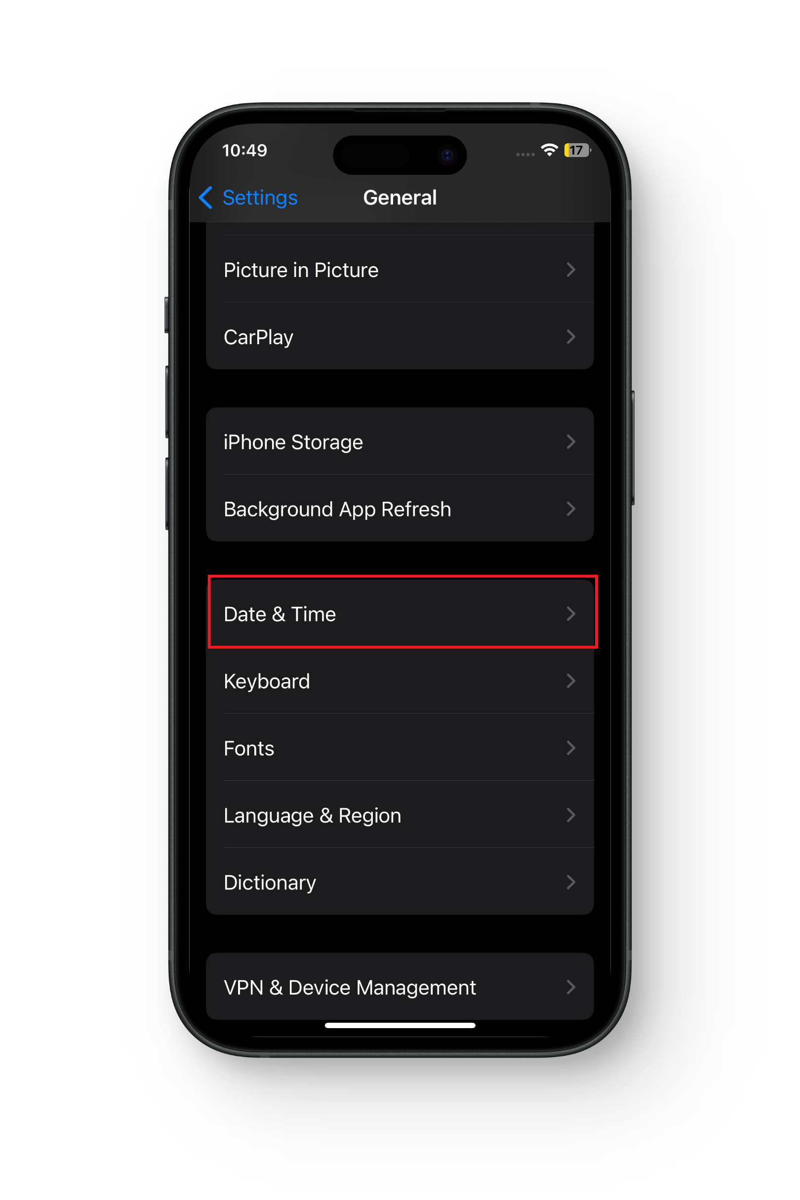 - مرر لأسفل واضغط على “التاريخ والوقت.”
