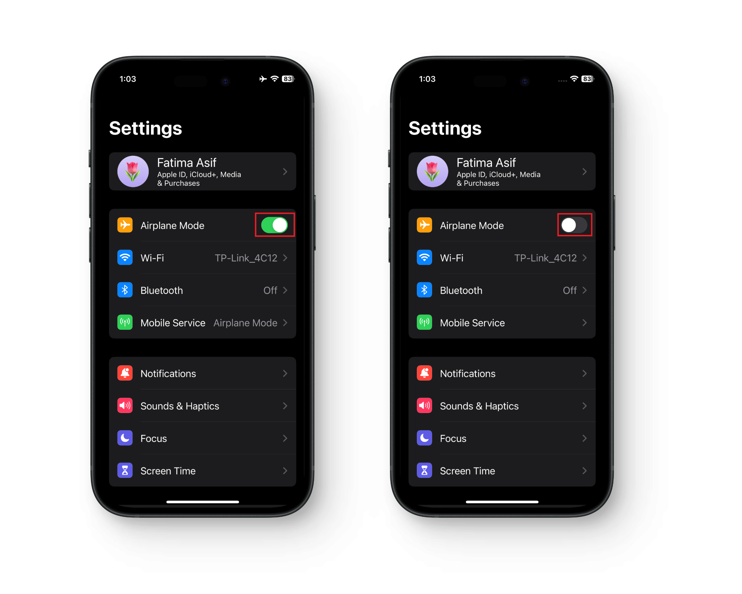 - تفعيل وضع الطيران: قد يؤدي نسيان تعطيل وضع الطيران إلى منع جهازك من إنشاء اتصال مناسب لمكالمات FaceTime.